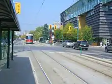 North of College Street, the avenue forms the western border of the University of Toronto and is home to several businesses catering to students, as well as university facilities such as the Athletic Centre and a number of student residences such as University of Toronto Graduate House. Just north of College Street, the roadway splits into a traffic circle, called Spadina Crescent. The building in the centre of the circle was originally built as Knox College, but it was renovated in 2017 to become the Daniels Building, which houses the Faculty of Architecture.[13]
