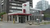 The main entrance to the Yonge–University line part of the station is concealed inside a house at 85 Spadina Road, which was built in 1899 and listed as a heritage property by the City of Toronto in 1974.[6] The building was designed by architect Robert Ogilvie[7] for lawyer Norman Gash. The property had previously been needed for construction of the Spadina Expressway, which was cancelled in 1971. Since it was still planned to build the subway on its original route along the course of the expressway, the site was subsequently acquired by Metropolitan Toronto in 1972, with the intention of replacing it with a new station building. Local protest forced the TTC to repurpose the old building, thereby retaining the residential character of the neighbourhood.[8][9] Opposite the house, on the west side of Spadina Road at Kendal Avenue, there is an uncovered stairwell entrance to the station mezzanine. There are northbound and southbound bus stops outside the entrances. This entrance only accepts Presto cards.