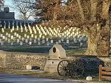 The 1864 Gettysburg Battlefield Memorial Association (GBMA) added to McConaughy's land holdings and operated a wooden observation tower on East Cemetery Hill from 1878–1895.[21][G 4] Post-war, John Bachelder invited over 1,000 officers, including 49 generals, to revisit the field with him.[20] Bachelder also produced a battlefield survey with 1880 federal funds (initiated by Senator Wade Hampton III, a Confederate general). The GBMA approved and disapproved various monuments and in 1888 planted trees at Zeigler's Grove. The 1st battlefield monument was an 1867 marble urn in the National Cemetery dedicated to the 1st Minnesota Infantry, and the 1st memorial outside of the cemetery was the 1878 Strong Vincent tablet on Little Round Top.[3]: 210 By May 1887 there were 90 regimental and battery monuments on the battlefield,[22] and the first bronze monument on the battlefield was Reynolds' 1872 statue in the cemetery.[23] The only two Confederate monuments inside the Union areas of battle held are an 1887 plaque near The Angle commemorating Gen Armistead's farthest advance on July 3 and the 1884 2nd Maryland Infantry monument on Culp's Hill.
