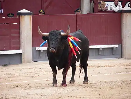 The bull then enters the ring to be tested for aggressiveness by the matador and banderilleros with the magenta and gold capote (dress cape).[22] Bulls are raised on the open range by specialist breeding estates called ganadería. The bull enters the arena with a rosette on its back bearing the colours of the estate of its origin.[23]