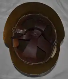 While being of similar shape to the M26 helmet, the M34 has many unique design features to distinguish itself. The shell is made of inferior material, only having 1 mm (0.039 in) thick steel and being lighter in overall weight to the M26, giving it worse ballistic and crash characteristics to the M26.[2] The shell generally being painted in a sand color or light brown, with surviving examples being refurbished in the 1943 order with green paint and a frontal bracket. The liner is quite different from its army cousin, instead of being attached by seven rivets around the sides of the shell, the liner is affixed using sheet metal wire from the circumference band holding the pads to the very top of the shell by means of a single rivet. The liner features four smaller leather pads as opposed to the three on the M26. Behind said pads are four paltry sized felt pads to give cushioning between the pad and liner band. The chin strap is a simple belt and buckle system for wear. Post-Civil War the helmet would be held in reserve along with previous models until the 1970s with their total replacement by the M42 helmet.[3]
