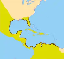 ![]() Spanish possessions (yellow) in the Caribbean region, with the coastline of the Spanish Main indicated (thick maroon line). | |