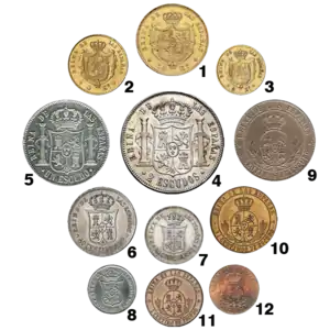 Copper coins were issued in denominations of +1⁄2, 1, 2+1⁄2 and 5 céntimos; silver coins of 10, 20 and 40 céntimos, 1 and 2 escudos; and gold coins of 2, 4 and 10 escudos. The 1 escudo was introduced in 1864, followed by the other silver and gold coins in 1865 and the copper coins in 1866. All the coins were minted until 1868, with 10 escudos also minted in 1873 during the First Republic.