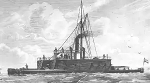 Designed and constructed by the Reales Astilleros de Esteiro at Ferrol[1] to meet an Armada requirement for a floating battery capable of providing gunfire support to troops ashore during the Third Carlist War, Duque de Tetuán was of wooden construction, its hull plated with iron armor 100 millimetres (3.9 in) thick.[2] Some of the armor plate used in the construction of Duque de Tetuán came from the earlier armoured frigate Tetuan,[3] which had burned under suspicious circumstances during the Cantonist rebellion at Cartagena.[4]