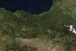 A term sometimes used in official and semi-official prints until the mid-19th century, usually referring to the Basque lands without Navarre and specifically Álava, Biscay and Gipuzkoa[2] or to Álava, Biscay, Gipuzkoa and Navarre.[3] It started to get out of circulation when applied to Basque territories in the early 19th century, with increasing usage focused on Santander and the adjacent area; the Santander province created in 1833 was originally to be named Cantabria. In public usage the term was already firmly related to Santander when the Basque nationalist movement emerged in the late 19th century. Today "Cantabria" is official name of the autonomous community centered upon Santander; also in unofficial circulation the term is used likewise, with application to Álava, Biscay, Gipuzkoa and/or Navarre only in historical discourse.[4]