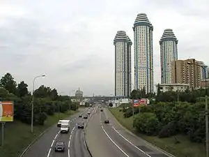 Sparrow Hills or Vorobyovy Gory (Russian: Воробьёвы Го́ры) is a residential complex in Moscow. The complex located at the base of Sparrow Hills and comprises seven buildings. 1,039 apartments are located in that complex, that was completed in 2004. As of 2007, its building 2 is the 4th tallest building in Moscow and the 3rd tallest residential building in Europe, with the tallest being a fellow Muscovite, the Triumph-Palace. The complex' address is Mosfil'movskaya ulitsa, 70. Tower Four is