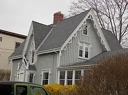 The Sparrow House is set on the northwest side of Arlington Street, a residential street between Forest Avenue and Back Cove in Portland's Woodford's Corner neighborhood. It is a 1+1⁄2-story wood-frame structure, with a steeply pitched gable roof and vertical board siding. The side gables and a front-facing gable above the entrance are decorated with intricate bargeboard. The front gable has a Palladian-style three-part window formed out of narrow lancet-arched windows. A single-story (ell) extends to the right of the main block.[2]