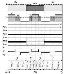 Fig 6 shows the formation of the dc-link voltage u and dc-link current i within one switching period Furthermore, it shows as an example the switching functions of the rectifier and inverter stage for in interval and in interval . Input stage switching occurs at zero dc-link current. The dc-link current has a constant average value within and . The switching state functions are given as , and . The switching frequency ripple of and is neglected.