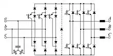 The Sparse Matrix Converter is an AC/AC converter which offers a reduced number of components, a low-complexity modulation scheme, and low realization effort.[1][2][3][4] Invented in 2001 by Prof Johann W. Kolar[5] , sparse matrix converters avoid the multi step commutation procedure of the conventional matrix converter, improving system reliability in industrial operations. Its principal application is in highly compact integrated AC drives.