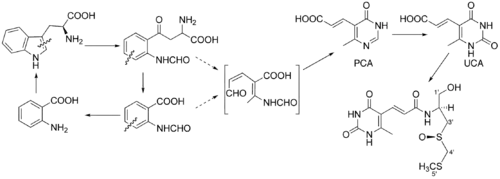Study of the biosynthesis of the sparsomycin in a greater detail has revealed that L-cysteine and S-methyl group of methionine are real precursors for the monooxo-dithioacetal group.[8] These studies have also confirmed the L-tryptophan being a predecessor of the uracil moiety of the sparsomycin. However, it still remained unclear whether the transformation proceeds through the kynureine pathway or not. The next paper published by the same research group has shown that this pathway is not responsible for the transformations of L-tryphophan in the biosynthesis of sparsomycin. In this paper the authors have also confirmed (E)-3-(4-oxo-6-methyl-5-pyrimidinyl)acrylic acid (PCA) and (E)3-(2,4-dioxo-6-methyl-5-pyrimidinyl)acrylic acid (UCA) being intermediates in the studied biosynthetic pathway.[9] Several years later an enzyme, which catalyzes transformation of PCA to UCA was found.[10]