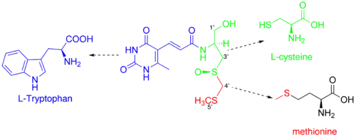 Although the structure of sparsomycin was published in 1970, no biosynthetic pathway for its formation was proposed in the literature up until 1988. Ronald J. Parry et al. have investigated biosynthetical precursors for the unusual monooxo-dithioacetal group.[7] By administering the radioactively labeled L-methionine to S. sparsogenes, they figured out that it was the most probable precursor for C-4' and C-5' atoms of the sparsomycin. However, when administering labeled cysteine, they found that C-4' did not contain any 13C while C-3' still did. This finding led them to an assumption that an enzyme called serine transhydroxymethylase could be responsible for the observation by conversion of the cysteine to serine residue. However, this assumption was not confirmed, as administration of 13C-serine did not produce any labeled sparsomycin. In this study the authors have finally concluded that S-methyl-D-cysteine should be the precursor for this part of the molecule. In this paper they have also proposed a L-tryptophan as a source of the uracil-containing part of the molecule.