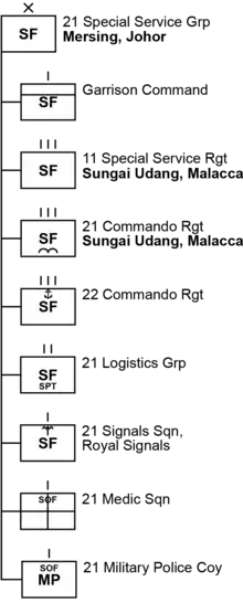 | 21st Signals Squadron, Royal Signals | 21 Skuadron Semboyan Diraja | 21 SSD | Sri Iskandar Camp | The 21 SSD is a special operations combat support unit tasked with providing communication support to all units under the command of the 21 SSG. | |