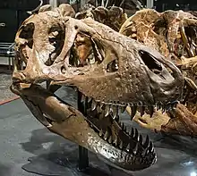 Victoria is a specimen found near Faith, South Dakota in 2013.[92] Victoria is estimated to be around 12 ft tall and 40 ft long, and she is thought to have died in her thirties.[93] Victoria has also been the subject of a traveling exhibition being displayed in places such as the Arizona Science Center.[94][95] Her cause of death is unknown; however, she was believed to have been bitten in the lower jaw by another Tyrannosaurus. The bite may have become infected, spreading and leading to sepsis.[92]