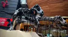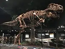 Bucky is a fossil of a juvenile specimen on display at The Children's Museum of Indianapolis in Indianapolis, Indiana. It is the first juvenile Tyrannosaurus ever placed on permanent exhibit in a museum.[51] The dinosaur remains were found in 1998 in the Hell Creek Formation near the town of Faith, South Dakota. The skeleton, transported by water, ended up in a low shallow valley along with bones from an Edmontosaurus and Triceratops. It was discovered by rancher and cowboy Bucky Derflinger.[52] Bucky was well preserved and easily prepared by the Black Hills Institute in South Dakota.[53] Part of The Children's Museum of Indianapolis Dinosphere exhibit,[54] Bucky is displayed along with Stan, an adult Tyrannosaurus, in a hunting scene. Both dinosaurs are attacking a Triceratops specimen known as "Kelsey".[55]