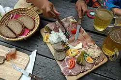 "Marende" is the local name of the snack ("Brettljause" in German). The snack consists of a wooden cutting board loaded with speck, sausages, local cheeses and pickled cucumbers, served together with farmers’ bread and wine. For the "Marende", the speck is served in a single piece about 3 cm wide and then cut into smaller pieces.