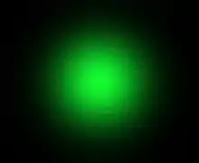 Laser speckle on a digital camera image from a green laser pointer. This is a subjective speckle pattern. (Note that the color differences in the image are introduced by limitations of the camera system.)