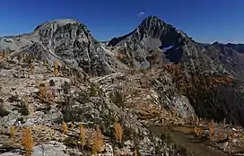 Spectacle Buttes are a pair of mountain summits located in the Entiat Mountains, a sub-range of the North Cascades, in Chelan County of Washington state.[3] The pyramid-shaped south summit is 8,392-foot (2,558-metre) in elevation, and the lower north butte is 8,080-foot (2,460-metre) in elevation. Spectacle Buttes are situated 77 miles northeast of Seattle in the Glacier Peak Wilderness, on land managed by the Wenatchee National Forest. Spectacle Buttes ranks 78th on Washington's highest 100 peaks, 81st on the "Bulger List", and seventh-highest in the Entiat Mountains.[1] The nearest higher peak is Marmot Pyramid on Mount Maude, 1.9 miles (3.1 km) to the west-northwest.[1] Precipitation runoff from the peaks drains into headwaters of the Entiat River. The first ascent of the south peak was made by Rowland Tabor and Dwight Crowder on August 20, 1953.[4][5]
