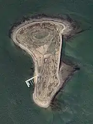 The island was initially composed of two small drumlins connected by a spit, with an approximate size of 49 acres (200,000 m2). The name is believed to derive from its then-resemblance to a pair of spectacles.[4] However, dumping of trash and dirt, together with subsequent landscaping, have resulted in a significantly larger island with a permanent size of 85 acres (340,000 m2), plus an intertidal zone of a further 28 acres (110,000 m2).