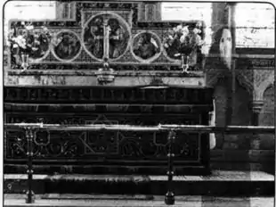 The Spectre of Newby Church (or the Newby Monk) is the name given to a figure found in a photograph taken in the Church of Christ the Consoler, on the grounds of Newby Hall in North Yorkshire, United Kingdom. The image was taken in 1963 by the Reverend Kenneth F. Lord.[1] As the figure appears to resemble a human, much speculation has been had regarding what type of person might be in the image. Most speculation by believers has concluded that it resembles a 16th-century monk, with a white shroud over his face, possibly to mask leprosy or another disfigurement. Others contend that it is an accomplice in a costume.[1]