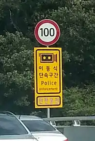 Speed limits in most areas are enforced exclusively by speed cameras instead of police officers. There is a tolerance of 10 km/h over the posted limit and reduced fines for exceeding the limit by 11 - 20 km/h.[4] Because of this, many Korean drivers consider the limit to be 11 km/h above the posted limit, meaning that a speed limit of 110 km/h may be treated as a speed limit of 121 km/h.[4]