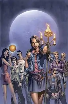 ![]() Cover to Spellbinders #1 Picture from left to right Mason, Renata, Paul, Kim, Foley, Mink and Liza Beth Art by Mike Perkins | |