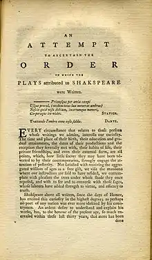 Archival material relating to Shakespeare was first identified by 18th-century scholars, most notably Edmond Malone, who recorded variations in the spelling of the name. Malone declared a preference for the spelling "Shakspeare", using it in his major publications including his 1790 sixteen-volume edition of the complete works of the playwright. George Steevens also used this spelling. Steevens and Malone had both examined Shakespeare's will, and were convinced that the final signature was spelled this way, which also conformed to the spelling used on Shakespeare's tomb. However, Malone admitted that the signature was difficult to read and that the others were clearly spelled without the final "a".[13] This spelling continued to be popular throughout the later Georgian period. Indeed "virtually every edition" of the playwright's work in the early 19th century before 1840 used this spelling. Even German scholars such as Friedrich Schlegel and Ludwig Tieck adopted it.[13]
