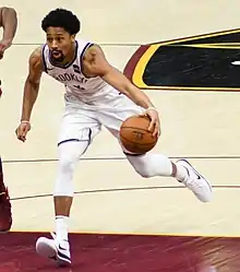 Spencer Gray Dinwiddie (born April 6, 1993) is an American professional basketball player for the Brooklyn Nets of the National Basketball Association (NBA). He played college basketball for the Colorado Buffaloes and earned first-team all-conference honors in the Pac-12 as a sophomore in 2013. He missed most of his junior year after injuring his anterior cruciate ligament (ACL). Dinwiddie recovered and was selected by the Detroit Pistons in the second round of the 2014 NBA draft. After two seasons with the Pistons, he joined the Brooklyn Nets in December 2016 and played with them until being traded to the Washington Wizards in 2021. In February 2022, Dinwiddie was traded to the Dallas Mavericks. In February 2023, he was traded back to the Brooklyn Nets.