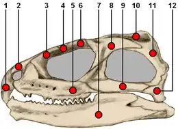 The ancestor of diapsids had a skull with two openings in the temporal region – upper and lower temporal fenestra on each side of the skull bounded by complete arches. The upper jaw is firmly attached to the posterior of skull.[26] This makes for a very rigid, inflexible construction. The skull of the tuatara has a similar structure, with both upper and lower temporal openings.[9][32]: 113 However, the lower temporal bar (sometimes called the cheek bone) is incomplete in some fossil Rhynchocephalia, suggesting its presence in the tuatara is a distinctive (autapomorphic) feature rather than one inherited from a common ancestor.[33]
