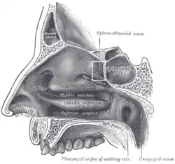 ![]() Lateral wall of nasal cavity (sphenoethmoidal recess labeled at top) | |