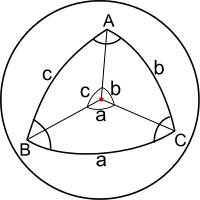 Spherical trigonometry is the branch of spherical geometry that deals with the metrical relationships between the sides and angles of spherical triangles, traditionally expressed using trigonometric functions. On the sphere, geodesics are great circles. Spherical trigonometry is of great importance for calculations in astronomy, geodesy, and navigation.
