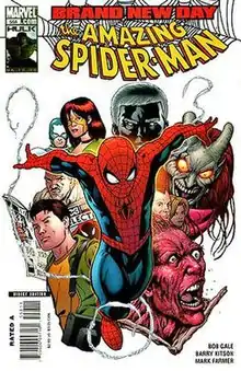 "Brand New Day" is a comic book storyline in The Amazing Spider-Man, published by Marvel Comics beginning in 2008. It chronicles the start of Spider-Man's adventures in the aftermath of the status quo-altering "One More Day" storyline,[1] and continues afterwards into "Spider-Man: Big Time". Although the banner only runs across the front covers of #546-564 and the Spider-Man: Swing Shift (Director's Cut) one-shot (itself a reprint, with new material, of the Free Comic Book Day 2007: Spider-Man one-shot), "Brand New Day" is also used to refer to the entire 102-issue run of stories featured in Amazing Spider-Man #546-647 and accompanying tie-in series, one-shots, and annuals.