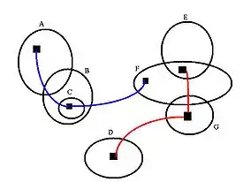 In the universe of discourse defined by this Euler diagram, in addition to the conjunctions specified above, all possible sets from A through B and D through G are available separately. The set C is only available as a subset of B. Often, in complicated diagrams, singleton sets and/or conjunctions may be obscured by other set combinations.