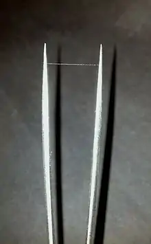 Silk fibre is a two-compound pyriform secretion, spun into patterns (called "attachment discs") that are employed to adhere silk threads to various surfaces using a minimum of silk substrate.[22] The pyriform threads polymerise under ambient conditions, become functional immediately, and are usable indefinitely, remaining biodegradable, versatile and compatible with numerous other materials in the environment.[22] The adhesive and durability properties of the attachment disc are controlled by functions within the spinnerets.[23] Some adhesive properties of the silk resemble glue, consisting of microfibrils and lipid enclosures.[22]