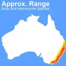 A. robustus is one of three designated species of the genus Atrax.[11][12] The related genus Hadronyche is represented by about 40 other dangerous species in eastern Australia, including Queensland and Tasmania. The males in this case have somewhat more potent venom than females and they also wander, making them more likely to be encountered in summer. Bites by males of two large species, the Sydney funnel-web and northern tree funnel-web, have resulted in death.[13] One specific case denoted an individual being bitten on the heel through his leather footwear after provoking the spider, indicating the great strength of the spider's chelicerae.