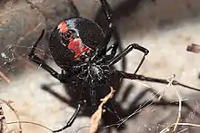 The redback spider's original range is considered to be parts of the South Australian and Western Australian deserts, from where it has since invaded the rest of Australia and several places overseas, including New Zealand, the United Arab Emirates, the United Kingdom and Japan.[14] The redback performs sexual cannibalism during mating, the female eating the male who sacrifices himself.[15] The most obvious sign of a redback bite is extreme pain accompanied by localised sweating, beginning three to five minutes after being bitten. The sweating then becomes more generalised. This is the result of the body reacting to its own neurotransmitter chemicals leaking from nerve junctions at the bite site. Systemic effects such as feeling sick, abdominal pain and nausea can be brought on by trauma and associated pain.[3] Four randomized controlled trials of redback antivenom, developed in 1956, have occurred. Isbister et al. reported in 2015 that any patient for whom antivenom is considered must be fully informed that there is considerable weight of evidence to suggest it is no better than placebo, there is a risk of anaphylaxis and serum sickness, and that routine use is therefore not recommended.[16]