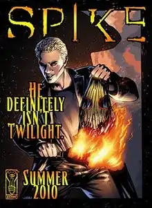 Most Spike-centric stories, however, have been published subsequent to Angel's finale episode. The 2005 IDW comic book Spike: Old Times, by Peter David, depicts Spike's encounter with the vengeance demon Halfrek, explaining his recognition of her in Buffy episode "Older and Far Away", and clarifying that she was in fact his beloved Cecily. Mutant Enemy approved the story, even though IDW did not have rights to a Buffy-only character like Halfrek, because of her importance to Spike's backstory, on the condition that the story's timing was deliberately ambiguous.[46] Following Angel's cancellation, Spike immediately appeared in the Angel miniseries Spike vs. Dracula by Peter David, a sequel to the Buffy episode "Buffy vs. Dracula" and expanding on the characters' century-old rivalry established in that episode. Scott Tipton's 2006 comic Spike: Old Wounds is detective fiction set during season 5, and also features allusions to Spike's activities in the late 1940s. Tipton's Spike: Lost and Found in 2006 is a season 5 story that acts as a sequel to the 1999 Buffy/Angel crossover episodes "The Harsh Light of Day" and "In the Dark", featuring the immortality-bestowing Gem of Amarra in 2005 Los Angeles. Lastly, writer Brian Lynch teamed up with Franco Urru to produce the story arc Spike: Asylum (2006–07), depicting Spike's stay in a supernatural medical facility. Although originally of the same ambiguous relationship to canon, the characters it introduced would reappear in the canonical Angel comic books to come later. Whedon appreciated Lynch's writing of Spike in Asylum so much that he commissioned him to co-write the canonical continuation of the series, Angel: After the Fall, in 2007.[47] Lynch and Urru also penned Spike: Shadow Puppets, featuring Spike and Lorne doing battle with the muppet demons of Angel episode "Smile Time" in Japan. In the explicitly canonical Whedon stories of 2007, Spike and Angel first appear in a joint cameo in Buffy the Vampire Slayer Season Eight (Dark Horse) as part of Buffy's sexual fantasies.[48][49] In the Dark Horse Presents #24 Season Eight tie-in, "Always Darkest", Spike and Angel appear (again in a dream sequence) at Buffy's side when she is fighting Caleb, but to her dismay the two start flirting with and kissing one another.[50] Spike appears in Season Eight properly at the conclusion of the "Twilight" story arc. Lynch's Spike series features some collaboration with Whedon to connect the IDW and Dark Horse series' continuities.[51] IDW had planned to launch the series as a bona fide ongoing series, and as such it establishes a support cast for Spike suited to his position headlining the title.[52] The transfer of Angel rights from IDW to Dark Horse necessitated that it end instead as an 8-issue miniseries.[53]