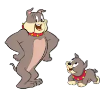 Spike and Tyke are fictional characters from the Tom and Jerry animated film series, created by William Hanna and Joseph Barbera. Spike[1] (who goes by different names in a few episodes - Killer for four episodes, Butch for two episodes, and Bulldog for one) is portrayed as an American Bulldog, who is generally amiable and friendly, and a loving father to his son Tyke in several episodes. However, Spike's character also has a very stern, and fierce side, for occasions such as when he is defending his son Tyke.