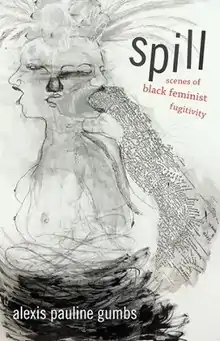 Spill: Scenes of Black Feminist Fugitivity is a 2017 book of prose and poetry by Alexis Pauline Gumbs.[1] It is a labor of love, and an experimental and poetic work of literary criticism based on the work of Hortense Spillers and the literary archive of freedom-seeking black women.[2] Containing the first syllable of Spillers’ last name, it is an ode to Hortense, the individual, as much as it nurtures–and is nurtured by–black femme folk across vast spatiotemporal locations. The subtitle, "Scenes of Black Feminist Fugitivity" nods to Saidiya Hartman’s Scenes of Subjection: Terror, Slavery, and Self-making in Nineteenth Century America.[3] The work pays homage to not just Saidiya, and not just Hortense, in fact not any singular "I" understood within a Cartesian "Cogito ergo sum" that would subordinate the collective to the individual. "When I turned these phrases, doors opened and everyone came through," Gumbs writes of her engagement with Spillers’ work, "all the black women writers Spillers wrote about and didn’t write about. All the characters those black women writers acknowledged and ignored."[1] Gumbs converses with black study and black womanhood: past, present, and future.