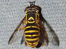'Spilomyia intertupta , the Interrupted Hornet Fly, is an uncommon species of syrphid fly first officially described by Williston, 1882.[1] This species is found in Western North America, along the California coast. Hoverflies get their names from the ability to remain nearly motionless while in flight. The adults are also known as flower flies for they are commonly found around and on flowers, from which they get both energy-giving nectar and protein-rich pollen. The larvae are known as the short-tailed larva, suited for moist areas such as rot holes of trees.[2]