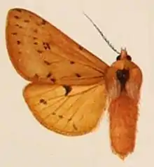 The head and thorax are ochreous tinged with fulvous; palpi and sides of frons black; a large black patch on prothorax with streak from it to metathorax; pectus black; femora crimson fringed with ochreous hair, the tibiae and tarsi black; abdomen pale crimson with a blackish dorsal streak on medial segments, the ventral surface ochreous, lateral and sublateral black points on medial segments. Forewing brownish ochreous; minute antemedial black spots on costa, below median nervure, and above vein 1; four black points at lower angle of cell; a postmedial series of black points on each side of the veins, excurved to vein 4, then incurved; a subterminal series of black points on each side of the veins from costa to vein 3, slightly excurved at vein 5. Hindwing pale ochreous yellow; a black discoidal lunule; subterminal black points on each side of vein 5 with traces of a series of points below it bent outwards to termen below vein 1; the underside with the costal area fulvous yellow, a slight postmedial black mark on costa.