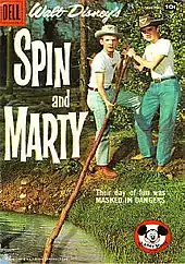 Western Publishing published comic book adventures of Spin and Marty beginning in 1956, first under Dell Comics Four Color title (#714, 767, 808, 826), then under their own title (#5-9), then in Four Color again (#1026 and 1082).[7] The comic books continued even after the television series had ended, such as issue number 7 in September, 1958 (pictured): Stollery and Considine, by then 17-year-olds, are depicted on the cover in their Spin and Marty characters, as they confront danger at the Triple-R Ranch. Disney included this cover with its 2005 DVD release. Gold Key Comics later reprinted some of these stories in their titles, such as the Walt Disney Showcase comic book issue of 1975, "The Treasure of Old Fort Resolute".[7]