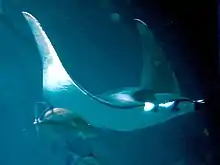 The spinetail mobula ray is a large ray which can grow up to a maximal width of 3.1 m (10 ft); average width is 2.3 m (7 ft 7 in).[5][6] Like most rays, it is dorsoventrally flattened and has relatively large triangular pectoral fins on either side of the main body disc. At the front, it has a pair of cephalic fins which are forward extensions of the pectoral fins. These can be rolled up in a spiral for swimming or can be flared out to channel water into the ventral mouth when the animal is feeding.