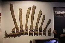 Six main partial specimens of Spinosaurus have been described. BSP 1912 VIII 19, described by Stromer in 1915 from the Bahariya Formation, was the holotype.[8][6] The material consisted of the following items, most of which were incomplete: right and left dentaries and splenials from the lower jaw measuring 75 centimeters (30 in) long; a straight piece of the left maxilla that was described but not drawn; 20 teeth; 2 cervical vertebrae; 7 dorsal (trunk) vertebrae; 3 sacral vertebrae; 1 caudal vertebra; 4 thoracic ribs; and gastralia. Of the nine neural spines whose heights are given, the longest ("i," associated with a dorsal vertebra) was 1.65 meters (5.4 ft) in length. Stromer claimed that the specimen was from the early Cenomanian, about 97 million years ago.[8][6]