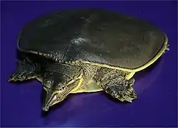 The spiny softshell turtle (Apalone spinifera) is a species of softshell turtle, one of the largest freshwater turtle species in North America. Both the common name, spiny softshell, and the specific name, spinifera (spine-bearing), refer to the spiny, cone-like projections on the leading edge of the carapace, which are not scutes (scales).