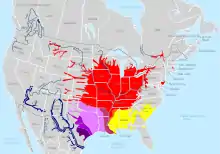 This species is the most widely distributed Trionychid in North America.[5] The spiny softshell has a wide range, extending throughout much of the United States, as well as north into the Canadian provinces of Ontario and Quebec, and south into the Mexican states of Tamaulipas, Nuevo León, Coahuila and Chihuahua.[1] As of recently, the spiny softshell has expanded its geographic range (through human assistance) into Washington State and California.
