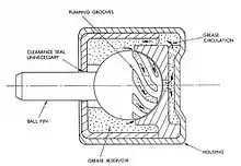 The image shows the grease lubricated spiral groove hemispherical bearing invented by Ron Woolley of the Gas Bearing Advisory Service at Southampton University in collaboration with British Gas.[6]
