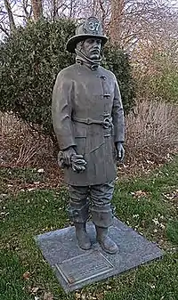 Spirit of the Firefighter is a public art work by American artist Mark Jeffries, located on the north side of Milwaukee, Wisconsin.[1] The bronze sculpture depicts a male figure wearing a firefighter's protective uniform: cuffed boots with trousers tucked inside, a long belted coat with toggle closures on the front, and a close-fitting hood.[2] On top of his head is a brimmed hat with an "Engine 37 MFD" badge on the front. The figure's arms and hands are at his side. In one hand, he holds his two gloves. The sculpture is installed at 5335 W. Teutonia Ave. at Milwaukee Fire Department Engine Company #37.