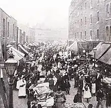 By the later 19th century, inner Spitalfields became known as the worst criminal rookery in London and common lodging-houses in the Flower and Dean Street area were a focus for the activities of robbers and pimps. In 1881 Flower and Dean Street was described as being "perhaps the foulest and most dangerous street in the metropolis".[25] Another claimant to the distinction of being the worst street in London was Dorset Street, which was highlighted by the brutal killing and mutilation of a young woman, Mary Jane Kelly, in her lodgings here by the serial killer, Jack the Ripper in the autumn of 1888.[26] The murder was the climax of a series of murders that became known as the Whitechapel Murders. The renewed focus on the area's poverty helped prompt the decision to demolish some local slums in 1891–94.[27] Deprivation continued and was brought to notice by social commentators such as Jack London in his The People of the Abyss (1903). He highlighted 'Itchy Park', next to Christ Church, Spitalfields, as a notorious rendezvous for homeless people.