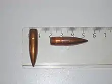The spitzer bullet (or spire point) is a pointed projectile that is primarily used in small-arms. The pointed nose shape, which was developed for military purposes in the late 19th and early 20th century, was a major design improvement compared to earlier rounder or flatter-tipped bullets because pointed nose shapes were less susceptible to external ballistic factors like drag. By adding a point, projectiles made for fully-powered and intermediate rifle cartridges obtain a lower drag coefficient, which makes them decelerate less rapidly. Lowering the drag coefficient leads to improved external ballistic behaviour.[1]