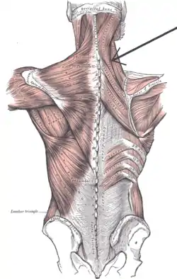 The splenius cervicis (/ˈsplniəs sərˈvsɪs/) (also known as the splenius colli, /- ˈkɒl/) is a muscle in the back of the neck. It arises by a narrow tendinous band from the spinous processes of the third to the sixth thoracic vertebrae; it is inserted, by tendinous fasciculi, into the posterior tubercles of the transverse processes of the upper two or three cervical vertebrae.